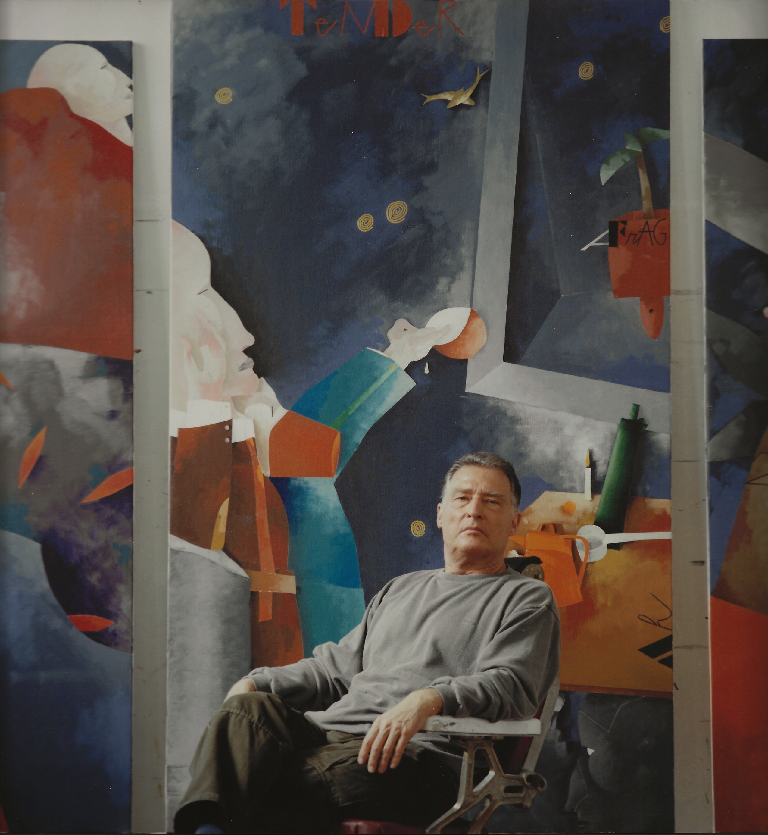 Nel periodo in cui realizzo il ciclo Profughi, Emilio Tadini fu molto colpito dai grandi cambiamenti politici e sociali. Nel 1989, anno della caduta del muro di Berlino, realizzò un ciclo di trittici ispirati a Max Beckmann. Per Tadini la storia si ripeteva. Rivedeva in quei cambiamenti sociali che poi portarono anche alla guerra in Jugoslavia, i tempi della guerra quando era bambino e frequentava il ginnasio e trascorreva più tempo nel rifugio che in aula. In particolare gli rimase impresso nella memoria il rischio che corse suo padre quando, da fervente cattolico qual era, si inginocchiò a pregare davanti a dei morti in Piazzale Loreto, tra cui c’era una insegnante. Lui, orfano di madre da quando aveva 6 anni, in quel momento colse quanto l’ideale di un uomo possa prevalicare sul tutto e stravolgere la vita degli altri.