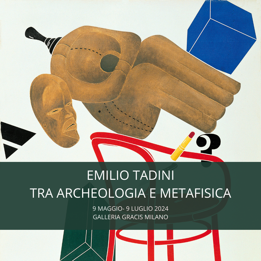 Tadini esordisce in campo artistico con una pittura fiabesca, di chiara matrice surrealista, e la sintesi che egli attua allo scadere degli anni ‘60 avviene proprio grazie all’adozione della chiave di lettura metafisica: la materia pittorica si alleggerisce, le immagini risultano meno affollate, i fondi si fanno chiari e spesso monocromi, suggerendo uno spazio più ideale che realistico. Tadini, infatti, supera la nostalgia del maestro greco per lo spazio rinascimentale: esso si fa evanescente, multidimensionale, concentra in sè differenti spazi e differenti istanti contemporaneamente. Come coglieva Guido Ballo nel 1966, nel catalogo della mostra alla Galleria il Punto di Torino, Tadini ha necessità di mettere in scena la realtà, ma la realtà allucinata del sogno, una via di mezzo estremamente personale tra surrealismo e metafisica. Uno spazio allusivo, una probabile “scena del crimine” in cui l’artista ci consegna elementi apparentemente slegati tra loro, la cui interconnessione diviene generatrice di una narrazione che, tuttavia, spetta solo al visitatore decodificare. I personaggi di Tadini agiscono in un contesto allusivo, sono figure ironiche, senza volto in quanto impenetrabili psicologicamente e con le quali l’artista ci impedisce di entrare in empatia. Tutto è ambiguo e tutto è possibile. Lo stesso enigma ci coglie nell’atto della contemplazione delle muse di Giorgio de Chirico, rese inquietanti proprio dal loro mistero, dalla loro collocazione casuale in uno spazio, così desolato, da risultare irreale. Tadini stesso, allora, ribalta nelle sue opere queste posizioni casuali all’infinito, generando nuove inquietanti relazioni, tutte possibili ma nessuna certa. E coglie, citandolo in tutto il ciclo, un altro elemento dal lavoro dechirichiano, la maschera tribale, che racchiude dentro di sè il senso del collocarsi all’interno di una tradizione, in un percorso evolutivo coerente che dall’archeologia e dal classico, giunge fino a de Chirico come processo lineare. Per questo motivo in mostra sono state inserite le maschere che hanno ispirato le opere di Tadini e che lo circondavano nel suo studio di Milano, per gentile prestito della Casa Museo Spazio Tadini. In mostra anche una versione bronzea degli Archeologi di de Chirico, soggetto a cui l’artista dedicherà moltissime opere. L’archeologo come individuo che scavalca i tempi, ci viaggia attraverso, riattualizza il passato, ricollocando la storia nel presente. Egli recupera frammenti di una civiltà, estraniandoli dal contesto e riattualizzandoli. Allo stesso modo agisce Tadini, che attua un recupero delle simbologie di de Chirico portandole al tempo presente, riscoprendo la storia e”Galleria Gracis è lieta di presentare la prossima mostra allestita negli spazi di Piazza Castello 16 dedicata al lavoro dell’artista milanese Emilio Tadini (Milano, 5 giugno 1927 – 25 settembre 2002). Artista e scrittore poliedrico, Tadini ha indagato nell’arco della sua carriera una molteplicità di tematiche, riunite solitamente in cicli, nella costante volontà di narrare la realtà a lui contemporanea.