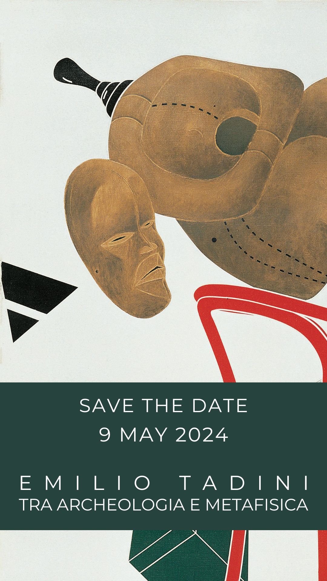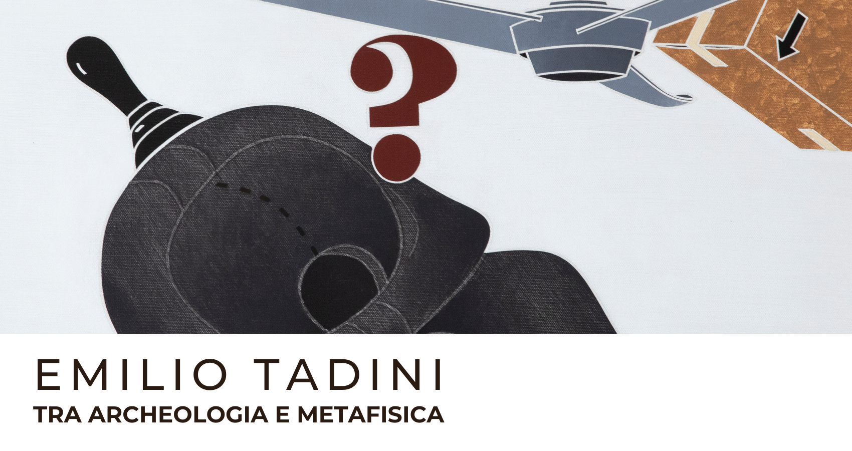 Il progetto di mostra si concentra sul ciclo di opere raggruppate sotto il titolo di Archeologia e Archeologia con de Chirico, realizzate da Tadini nei primissimi anni ’70. In esse emerge la fascinazione dell’artista per le atmosfere metafisiche e per l’opera del maestro di Volos. Le sue visioni oniriche abbracciano il senso profondo del lavoro dechirichiano, portando alle estreme conseguenze il discorso intrapreso con la Vita di Voltaire, ciclo oggetto di una mostra alla Fondazione Marconi nel 2019. La metafisica è la via che Tadini segue per tracciare il suo percorso artistico, ed è lo strumento mediante il quale supera il dualismo tra realismo socialista/arte informale. Approda, così, a una nuova forma espressiva che gli consente di occuparsi della figura umana, in un momento in cui essa viene estromessa dal lavoro degli artisti. Tadini esordisce in campo artistico con una pittura fiabesca, di chiara matrice surrealista, e la sintesi che egli attua allo scadere degli anni ‘60 avviene proprio grazie all’adozione della chiave di lettura metafisica: la materia pittorica si alleggerisce, le immagini risultano meno affollate, i fondi si fanno chiari e spesso monocromi, suggerendo uno spazio più ideale che realistico. Tadini, infatti, supera la nostalgia del maestro greco per lo spazio rinascimentale: esso si fa evanescente, multidimensionale, concentra in sè differenti spazi e differenti istanti contemporaneamente. Come coglieva Guido Ballo nel 1966, nel catalogo della mostra alla Galleria il Punto di Torino, Tadini ha necessità di mettere in scena la realtà, ma la realtà allucinata del sogno, una via di mezzo estremamente personale tra surrealismo e metafisica. Uno spazio allusivo, una probabile “scena del crimine” in cui l’artista ci consegna elementi apparentemente slegati tra loro, la cui interconnessione diviene generatrice di una narrazione che, tuttavia, spetta solo al visitatore decodificare. I personaggi di Tadini agiscono in un contesto allusivo, sono figure ironiche, senza volto in quanto impenetrabili psicologicamente e con le quali l’artista ci impedisce di entrare in empatia. Tutto è ambiguo e tutto è possibile. Lo stesso enigma ci coglie nell’atto della contemplazione delle muse di Giorgio de Chirico, rese inquietanti proprio dal loro mistero, dalla loro collocazione casuale in uno spazio, così desolato, da risultare irreale. Tadini stesso, allora, ribalta nelle sue opere queste posizioni casuali all’infinito, generando nuove inquietanti relazioni, tutte possibili ma nessuna certa. E coglie, citandolo in tutto il ciclo, un altro elemento dal lavoro dechirichiano, la maschera tribale, che racchiude dentro di sè il senso del collocarsi all’interno di una tradizione, in un percorso evolutivo coerente che dall’archeologia e dal classico, giunge fino a de Chirico come processo lineare. Per questo motivo in mostra sono state inserite le maschere che hanno ispirato le opere di Tadini e che lo circondavano nel suo studio di Milano, per gentile prestito della Casa Museo Spazio Tadini. In mostra anche una versione bronzea degli Archeologi di de Chirico, soggetto a cui l’artista dedicherà moltissime opere. L’archeologo come individuo che scavalca i tempi, ci viaggia attraverso, riattualizza il passato, ricollocando la storia nel presente. Egli recupera frammenti di una civiltà, estraniandoli dal contesto e riattualizzandoli. Allo stesso modo agisce Tadini, che attua un recupero delle simbologie di de Chirico portandole al tempo presente, riscoprendo la storia e collocandola hic et nunc.”